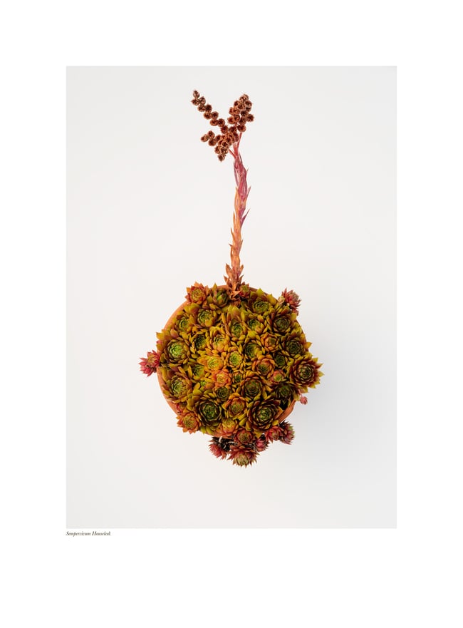 The print size is 19x14" with the image size at 14"x10". Made on Hahnemühle Hemp paper which is 290 gsm, 60% hemp fibre, 40% cotton. A very slightly textured paper. Blind embossed, captioned 'Sempervivum Houseleek' and signed.